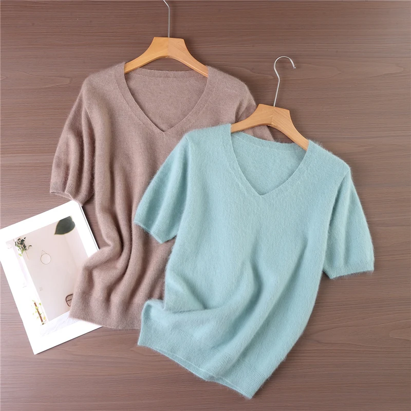 Women’s short-sleeved spring and autumn 100% pure mink cashmere T-shirt sweater women’s V-neck knitted solid color pullover